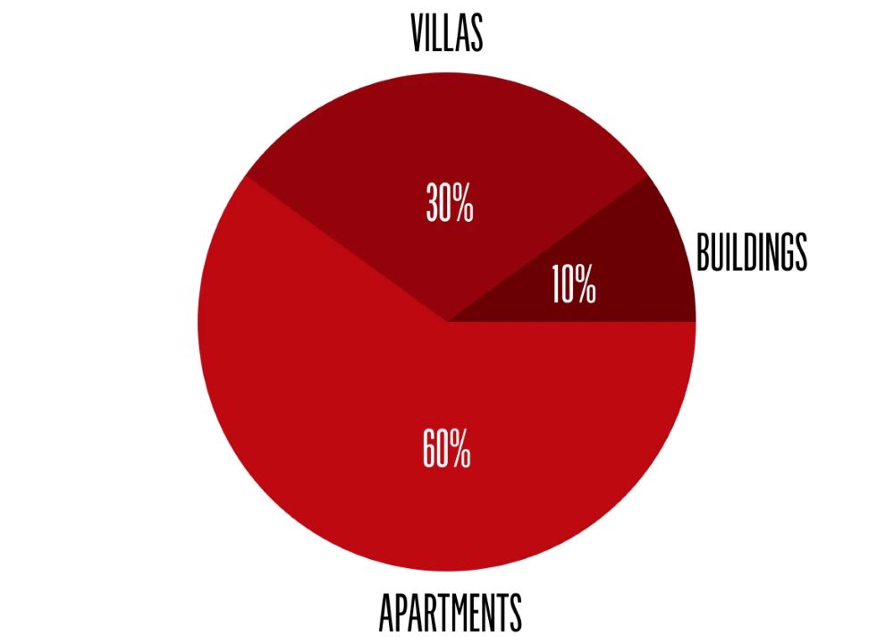 The analysis reveals that 60% corresponds to apartment projects, significantly surpassing villas (30%) and buildings (10%). This distribution highlights a clear preference for apartments among developers and buyers.