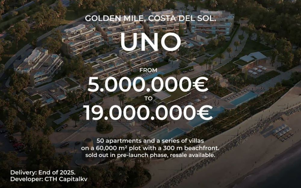 The uninterrupted views from the apartments span the Mediterranean Sea and the Strait of Gibraltar. The interest in this project is evident: UNO sold out during its pre-launch phase. Currently, apartments at UNO are being resold off-plan for prices ranging from €5 million to €19 million ($5.5 million to $20.8 million). The completion of construction is expected by the end of 2025. Back to list