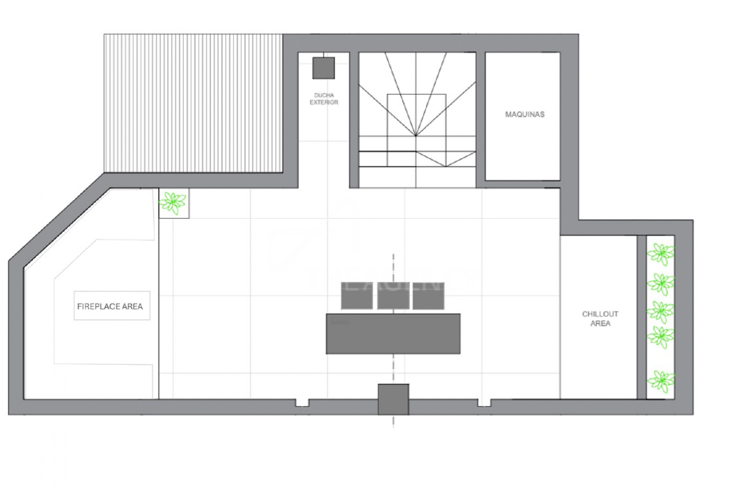 The rooftop solarium serves as an ideal extension of the living space. Features include a built-in lounge, bar area, outdoor shower, sunbeds, and a second bioethanol fireplace—framed by panoramic views that stretch from the coastline to the mountains.