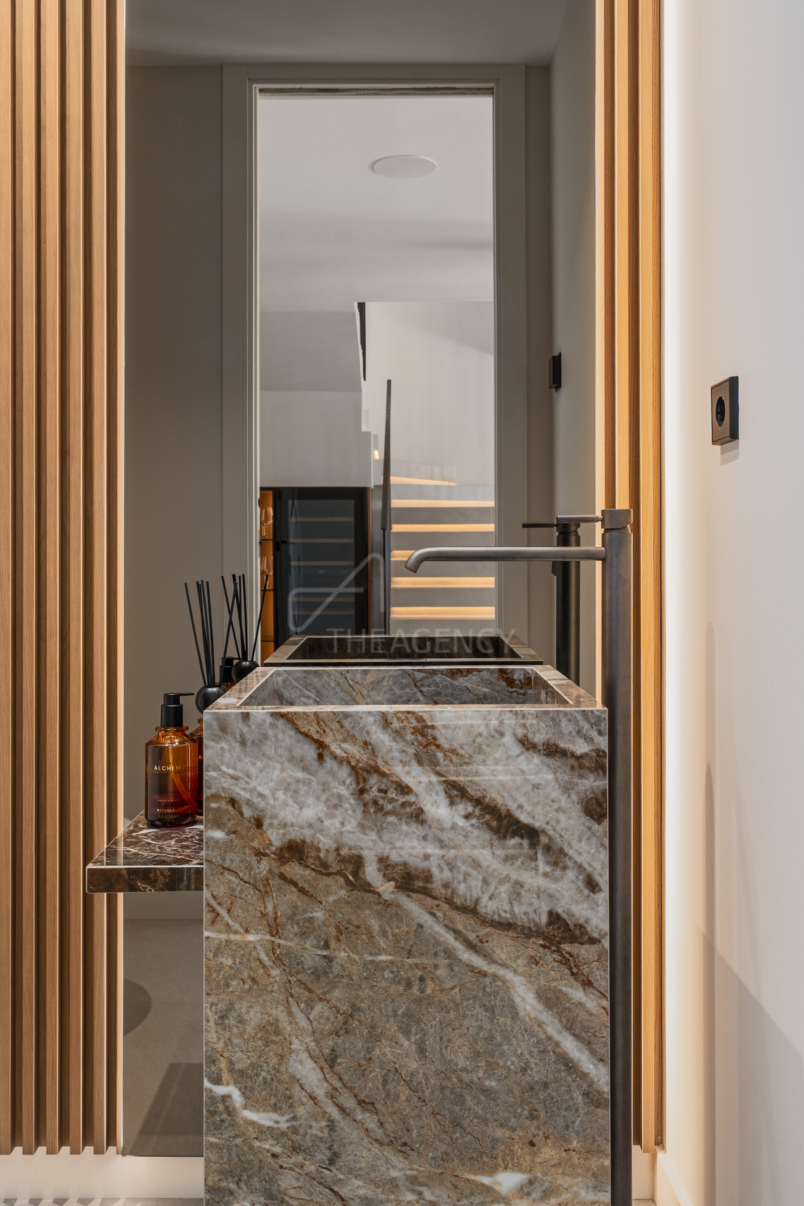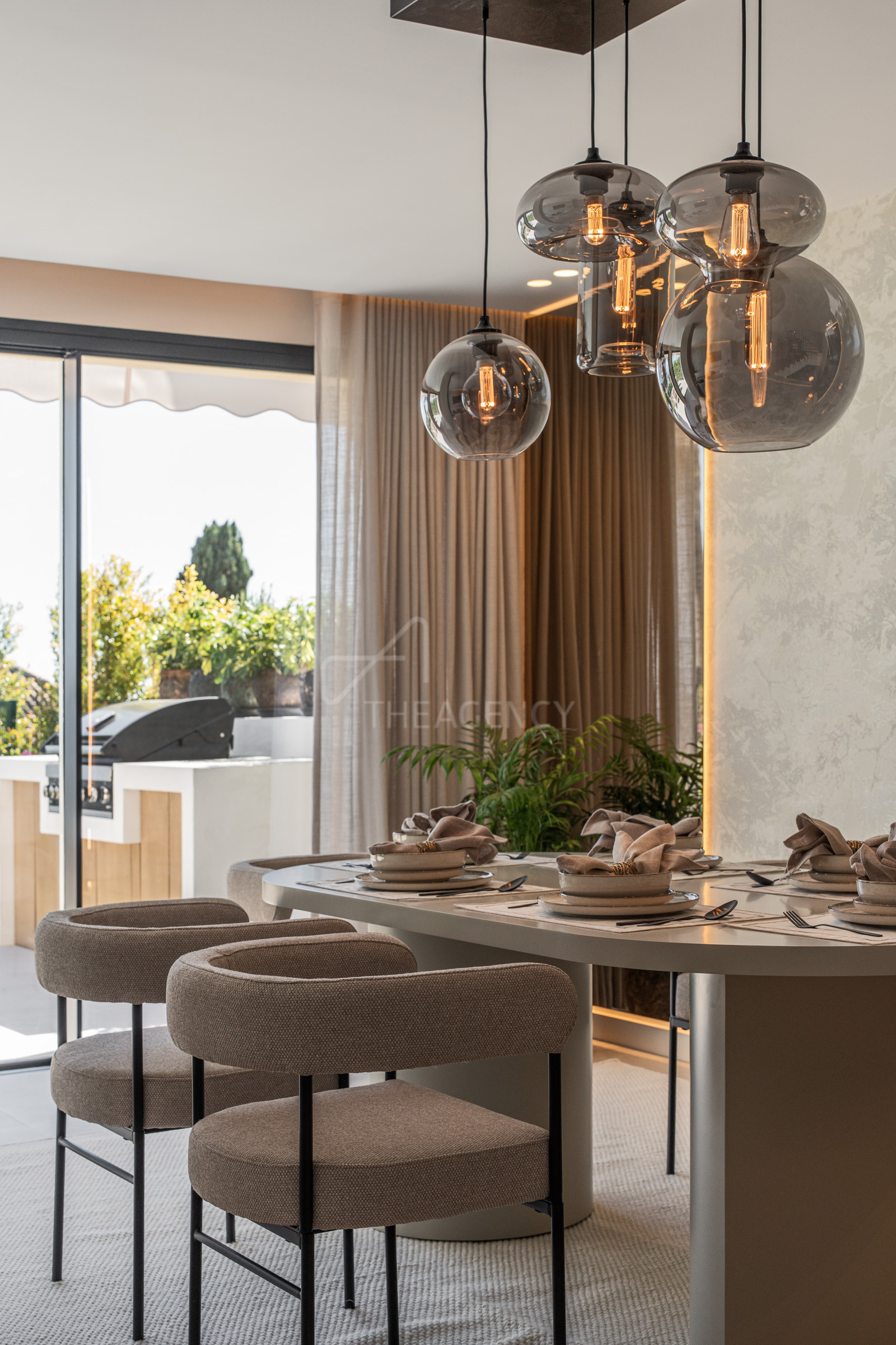 Set in the gated residential community of La Quinta Hills in Benahavís, this fully renovated three-level townhouse offers refined architecture and interiors inspired by Scandinavian minimalism. With a south-facing orientation and panoramic views of the Mediterranean Sea and La Concha mountain, the property presents a harmonious balance between design, comfort, and location.