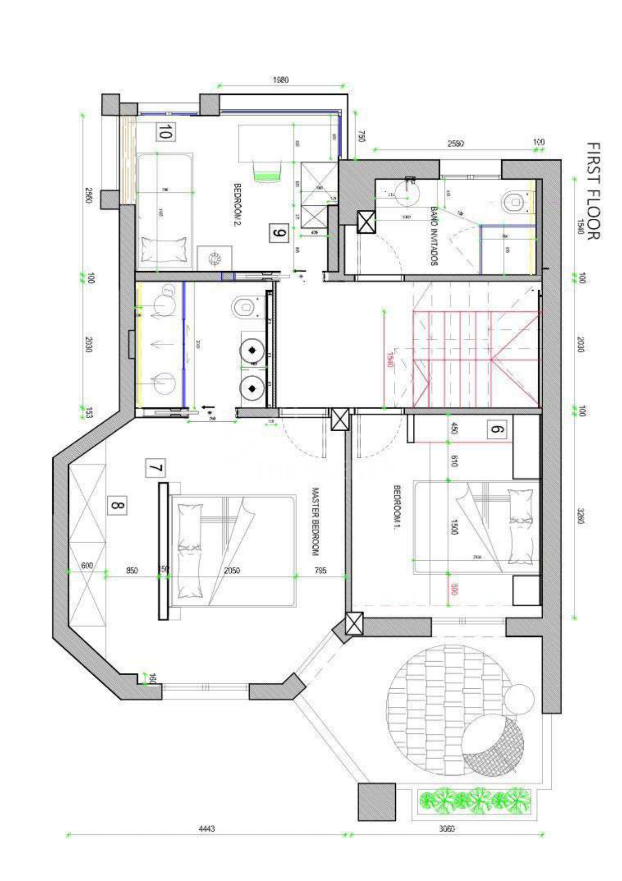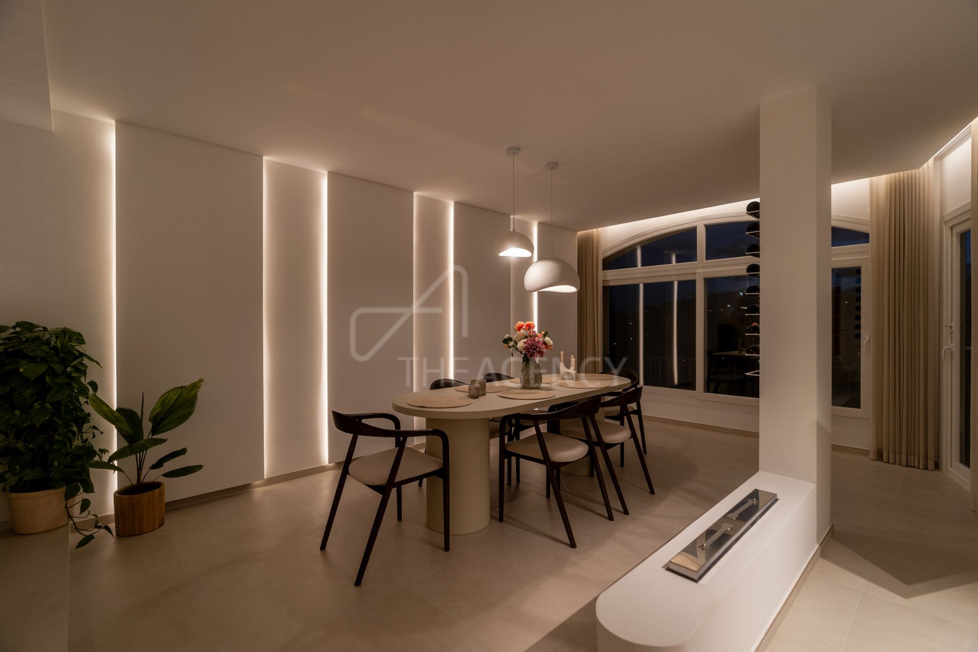Upstairs, three bedrooms include one with an en-suite bathroom. Two of the bedrooms open onto a shared terrace with elevated views. One of the rooms is currently used as a home office. Finishes have been updated in 2024, with clean lines and neutral tones throughout.