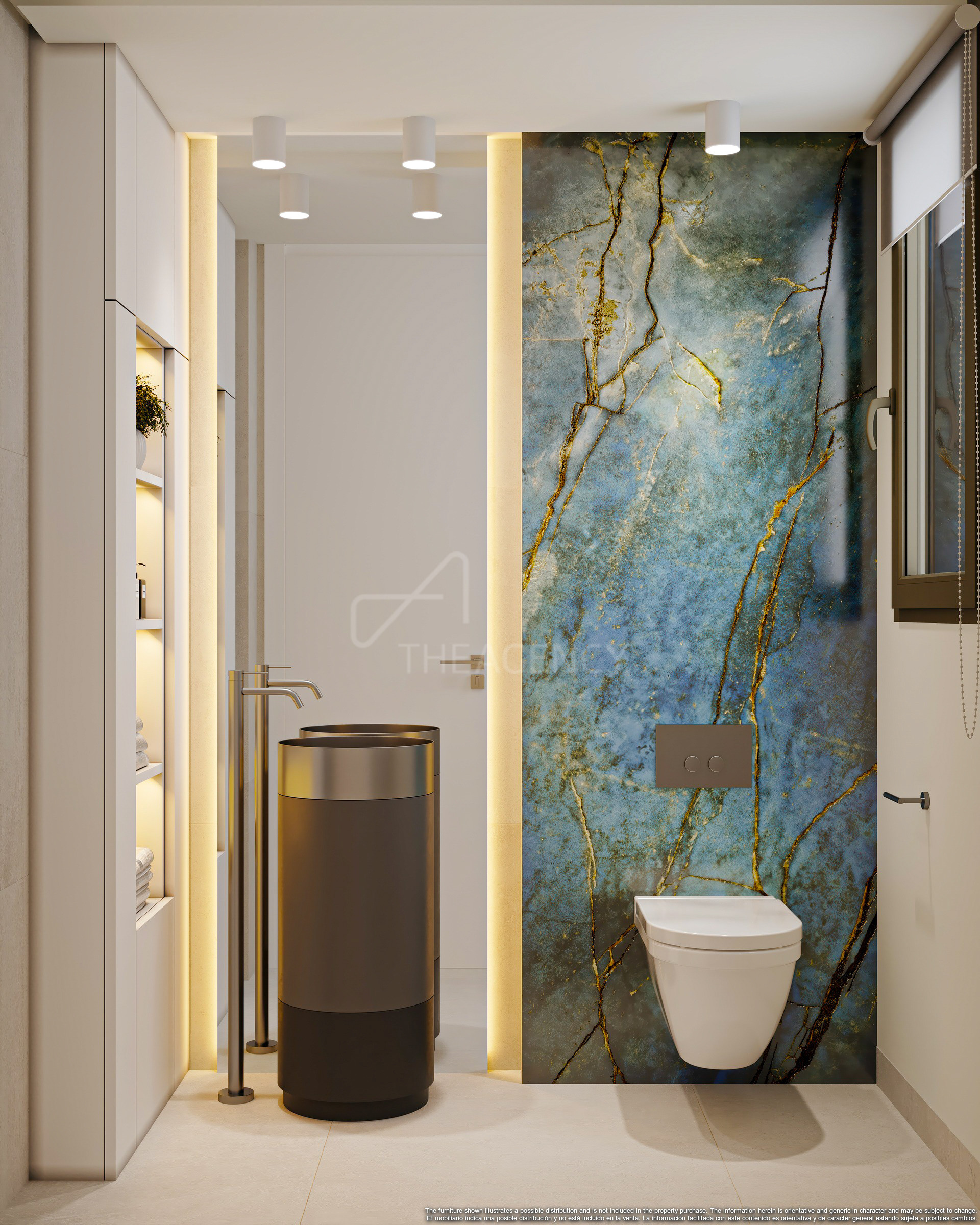 On the main level, the reception hall leads to a spacious living area with an open plan design that seamlessly integrates the interiors with the terrace.