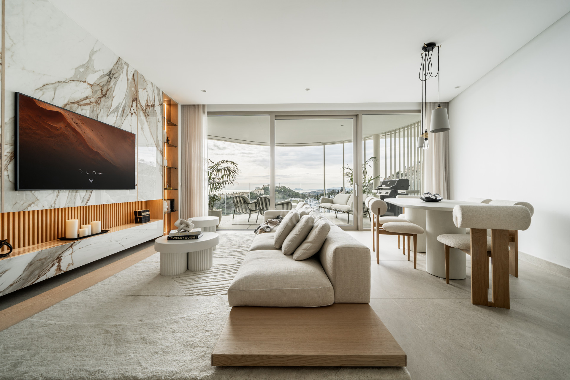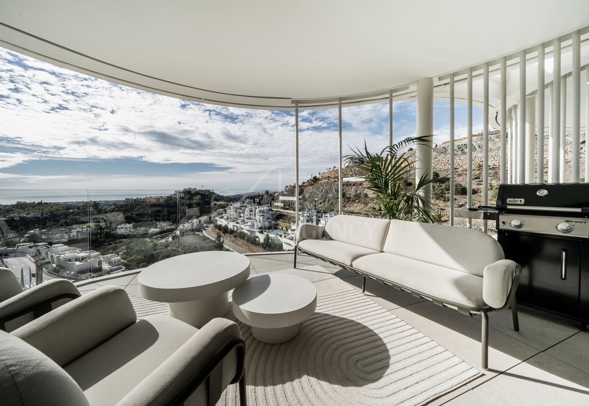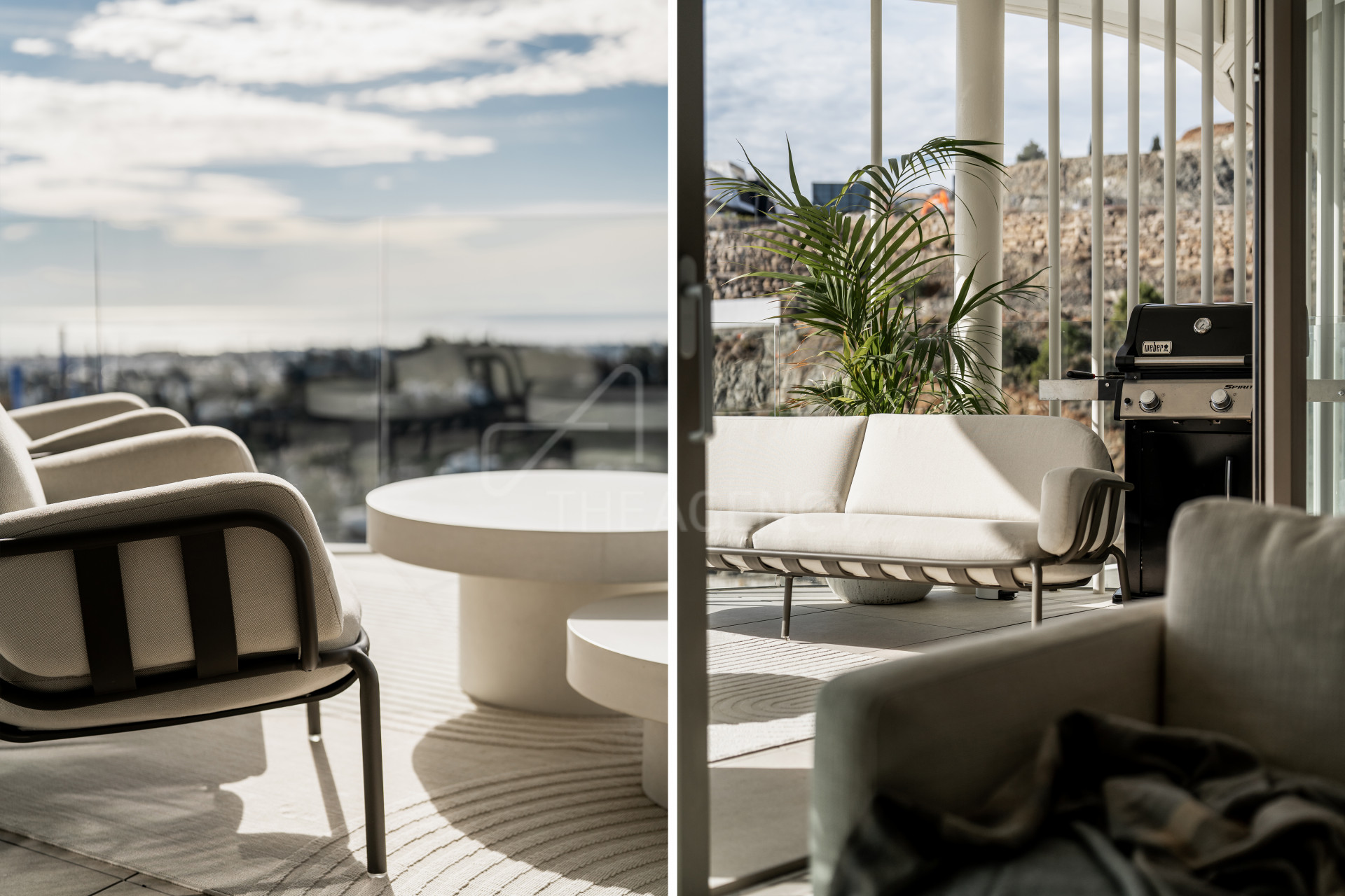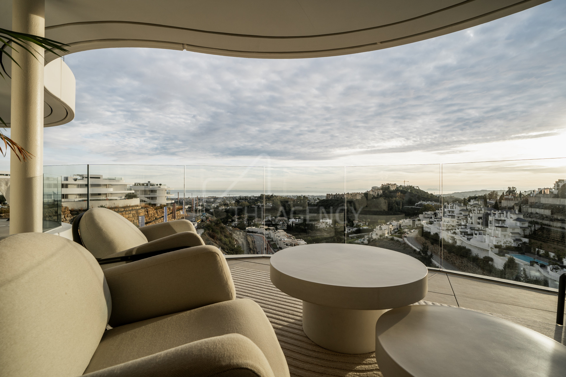 Contemporary 2 bedroom apartment in The View offering high-quality and top-tier materials and furnishings, as well as a spacious southwest-facing terrace where every corner unveils breathtaking panoramic views of the sea, golf course, and mountains.