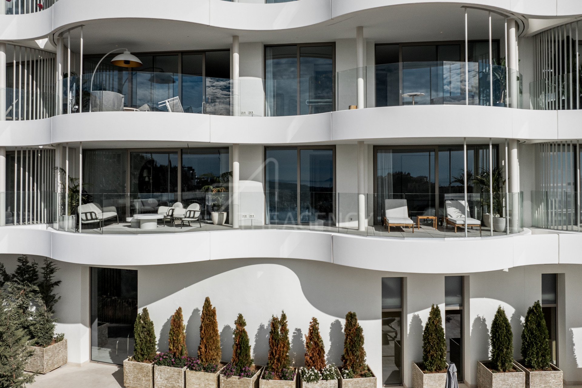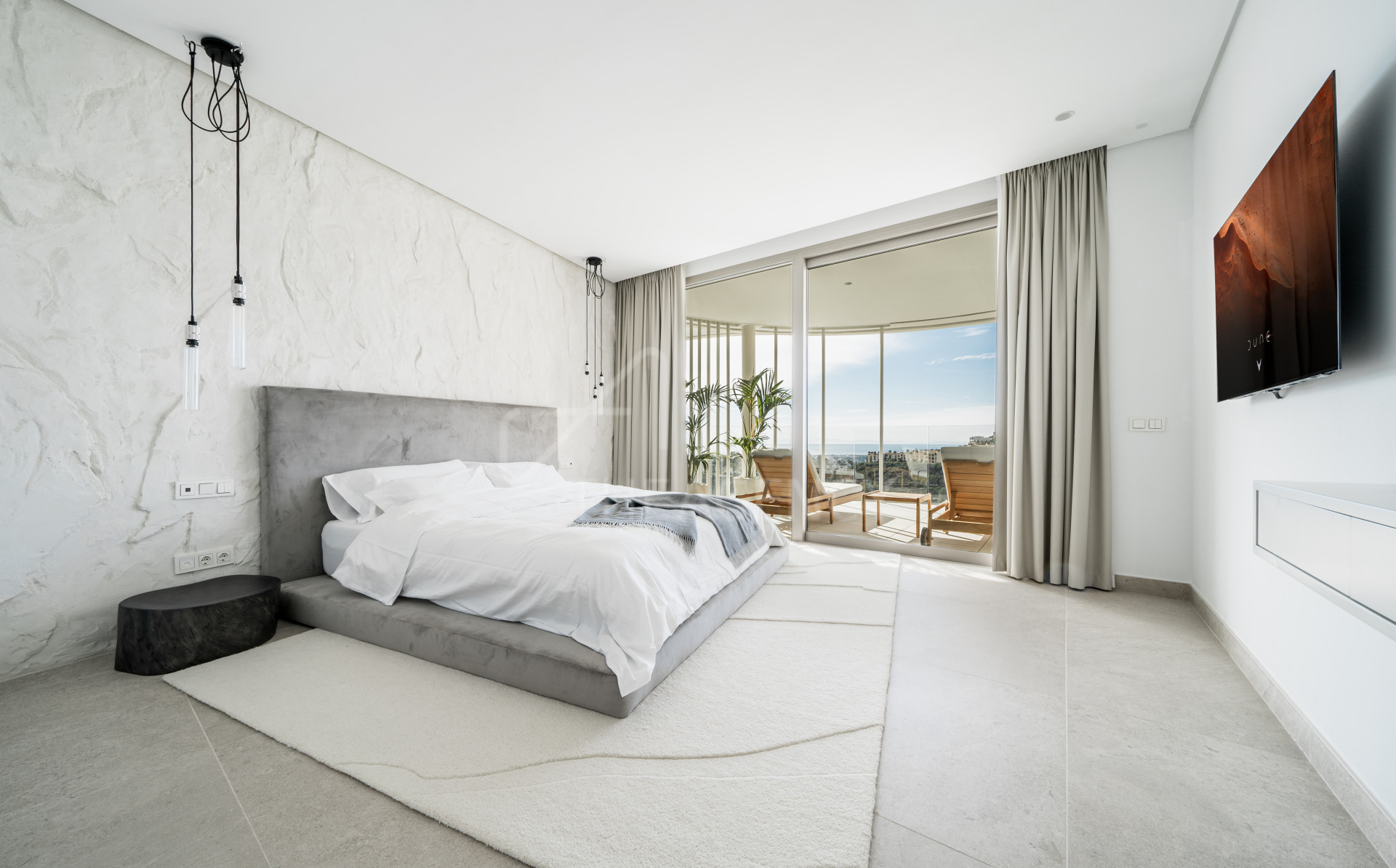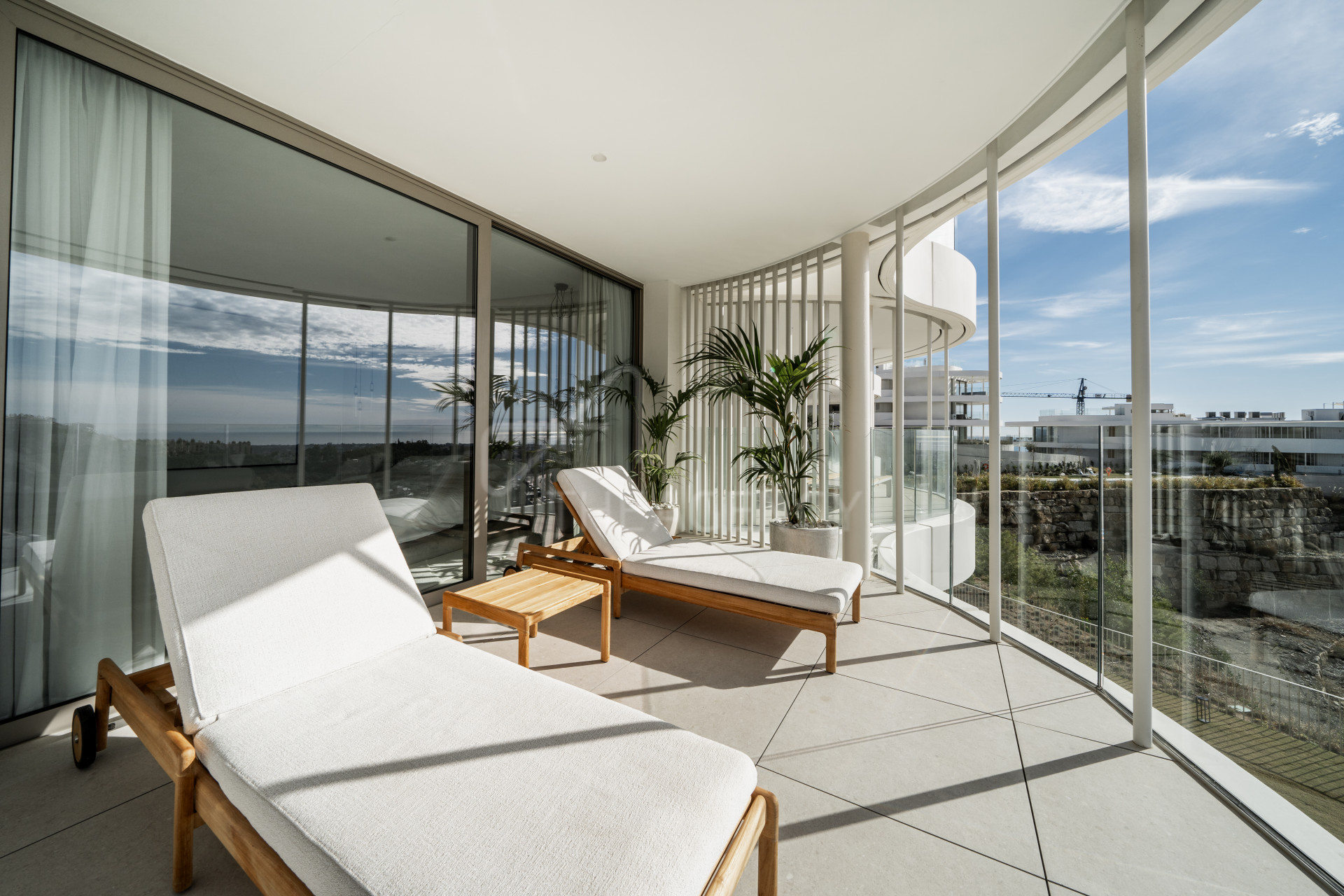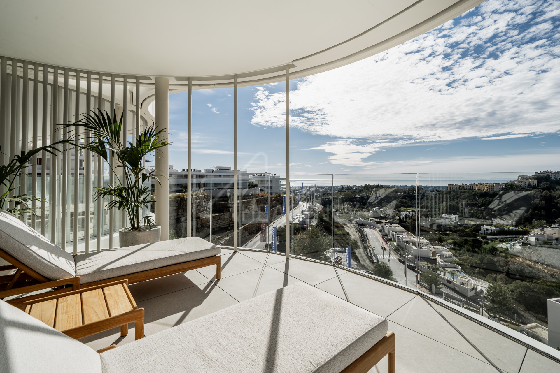 Contemporary 2 bedroom apartment in The View offering high-quality and top-tier materials and furnishings, as well as a spacious southwest-facing terrace where every corner unveils breathtaking panoramic views of the sea, golf course, and mountains.