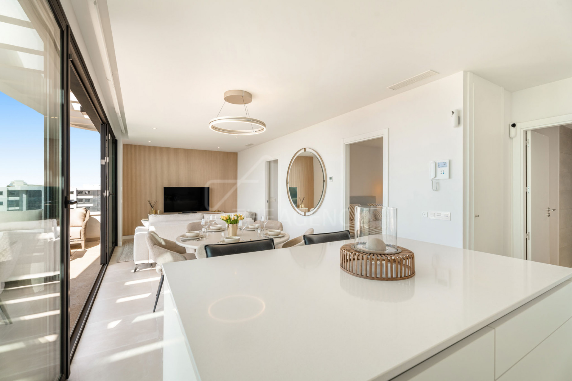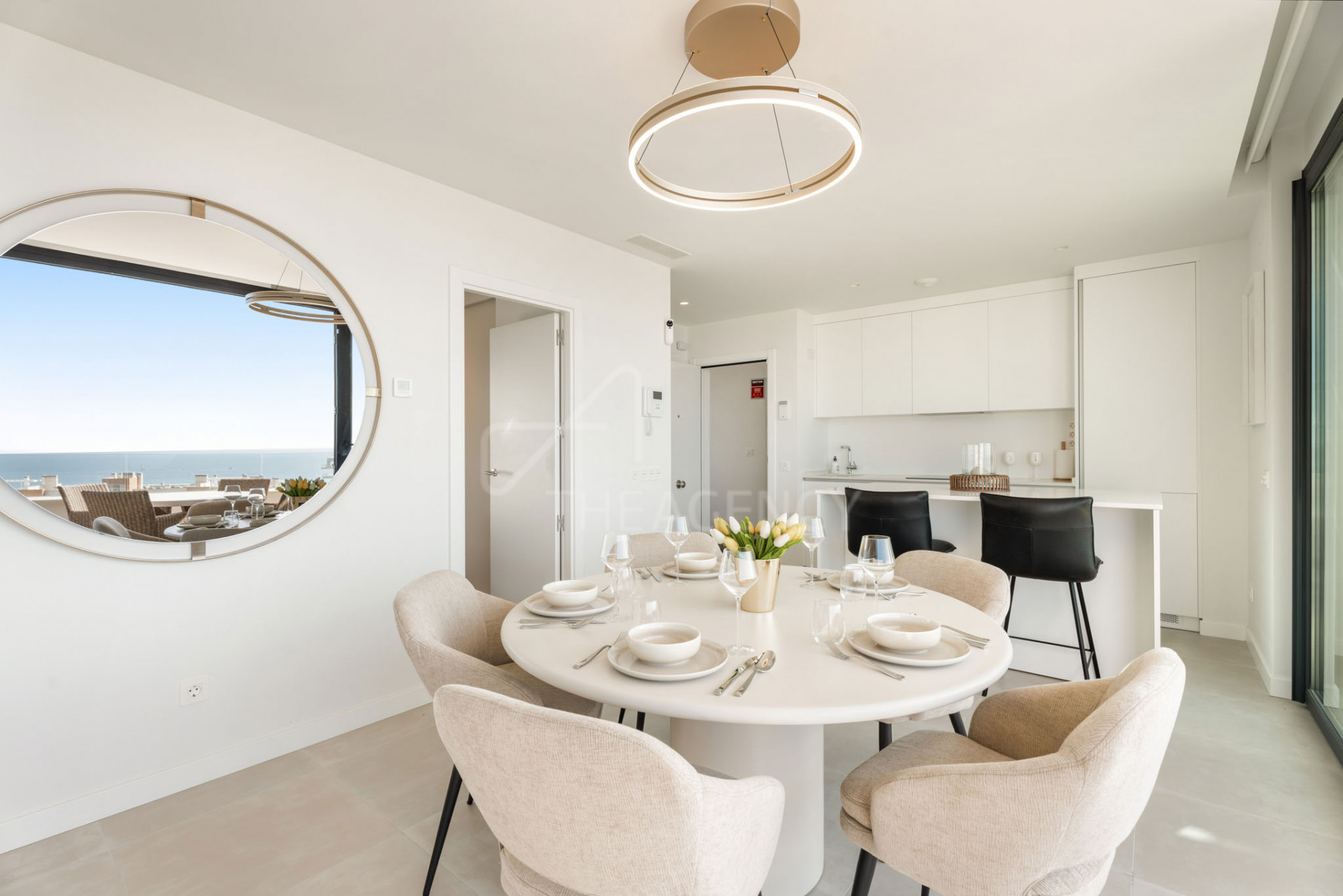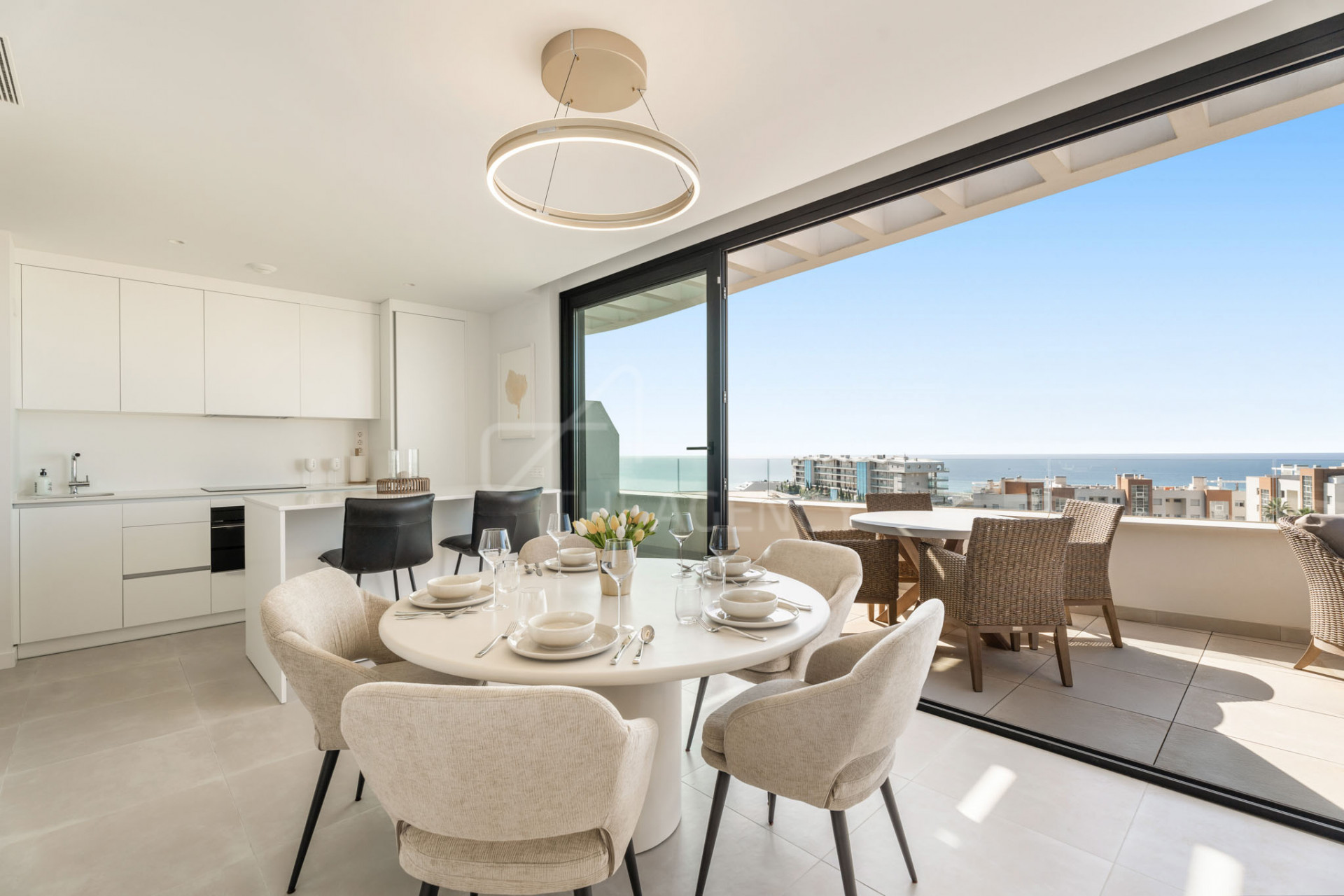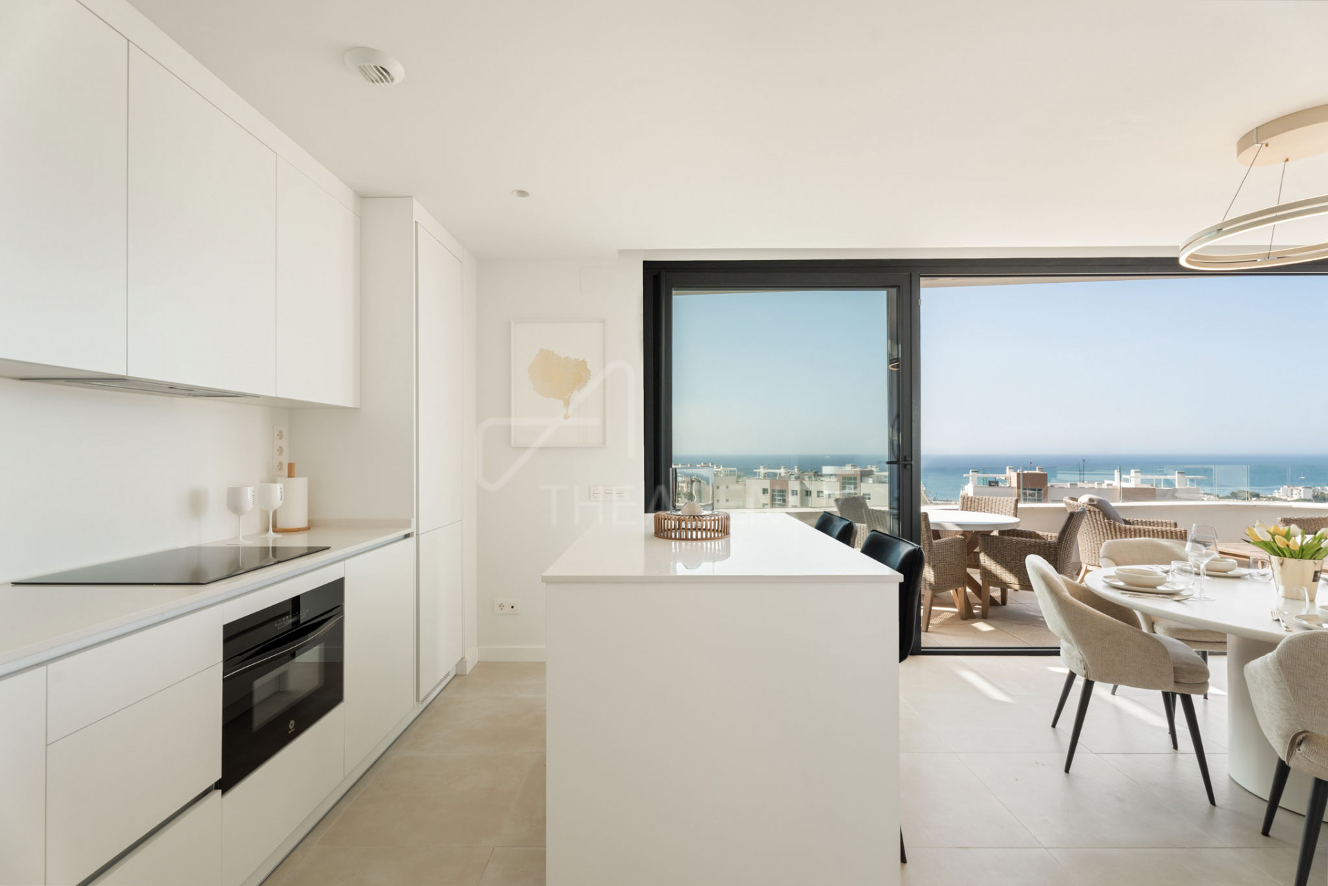 The open-plan layout connects the kitchen, dining, and living areas, with floor-to-ceiling windows that open to terraces facing the sea. The kitchen is fully equipped with integrated appliances and streamlined cabinetry. Interior finishes are clean and modern, with a consistent palette and durable materials used throughout.