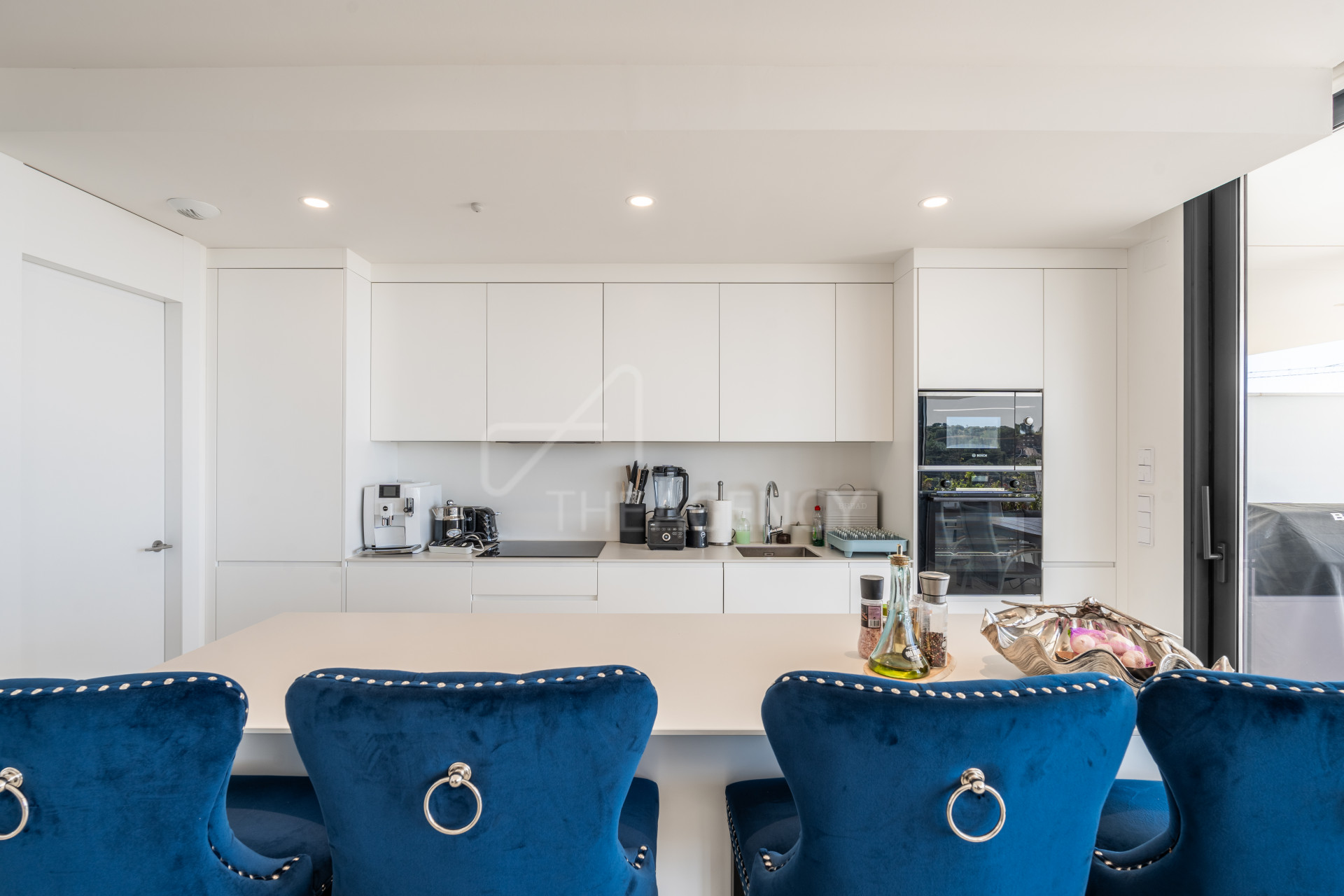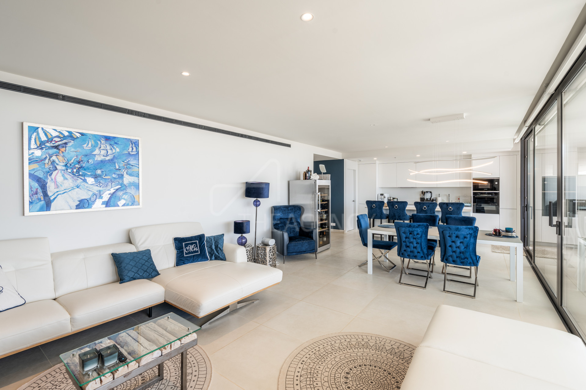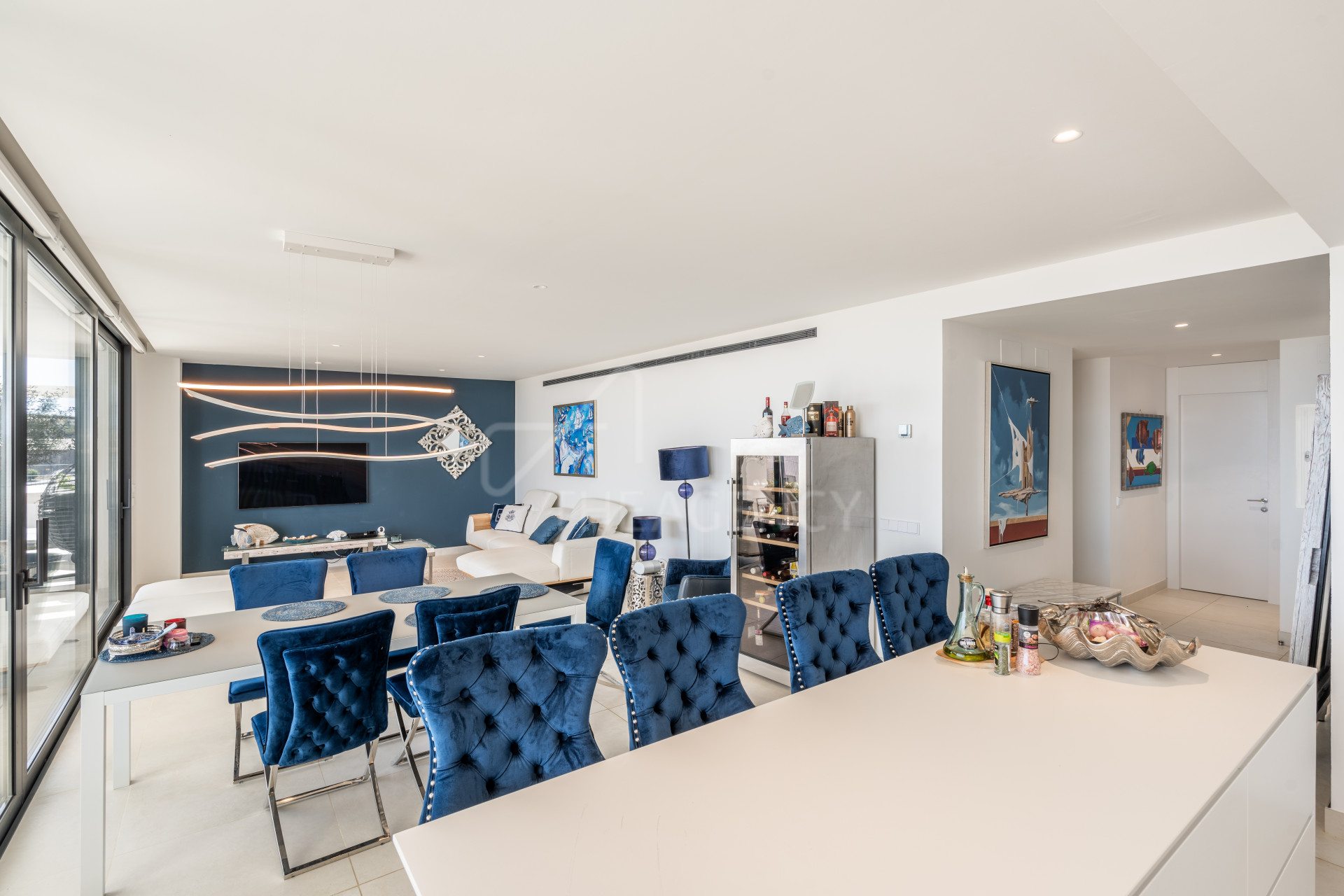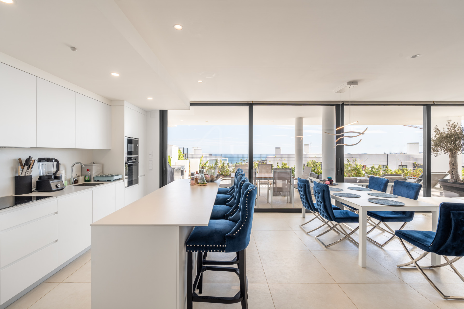 The apartment consists of three elegant bedrooms and two chic bathrooms, along with an additional guest toilet, making it both practical and plush. Each room reflects a blend of sophistication and comfort, creating a cozy yet airy atmosphere. The sleek open plan kitchen complements an inviting living space that opens out onto a panoramic terrace, offering breathtaking views of the sea and allowing for a seamless integration of indoor and outdoor living.