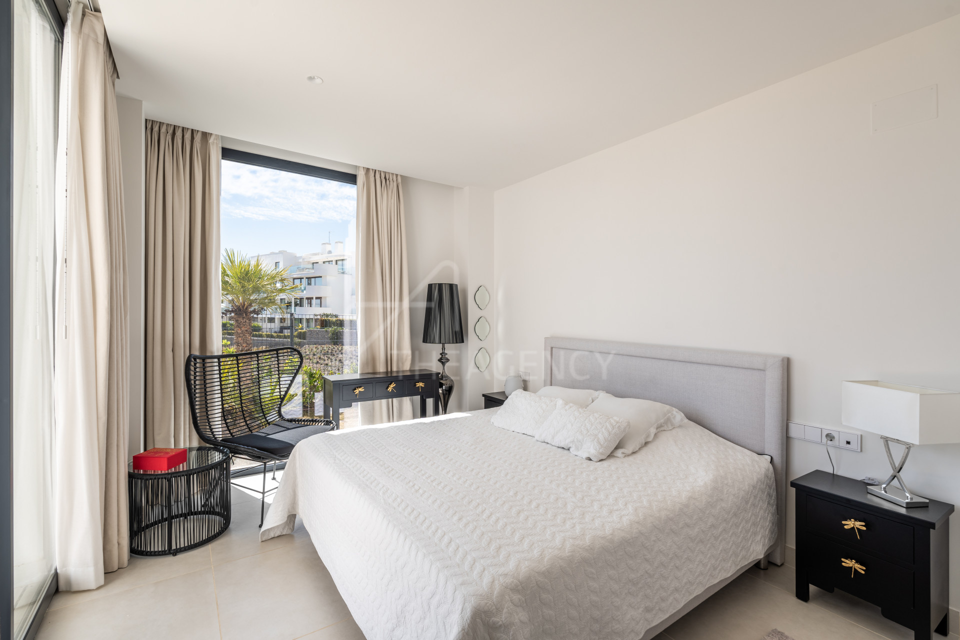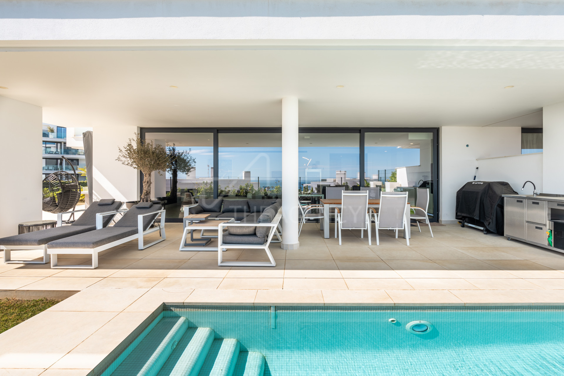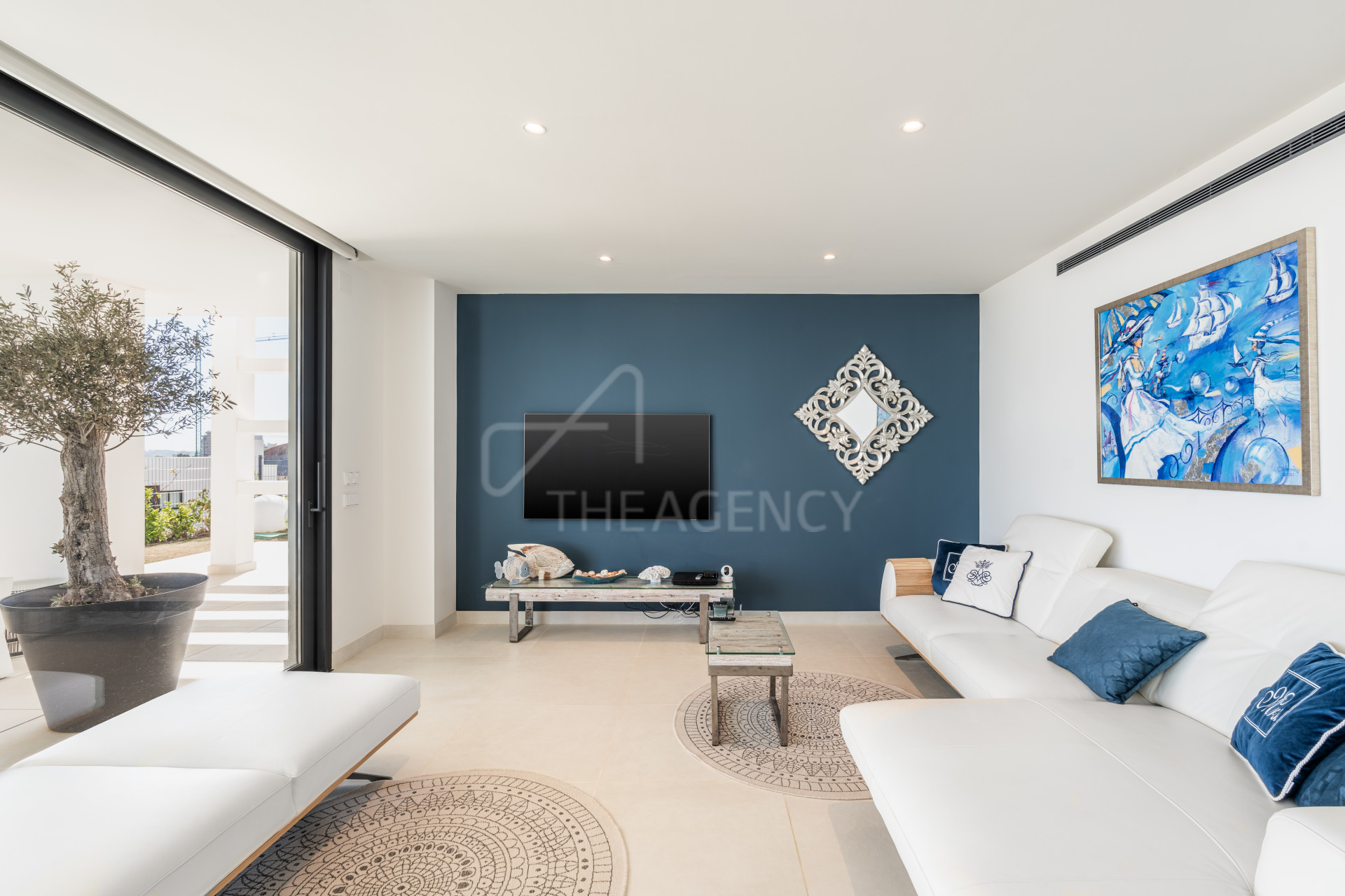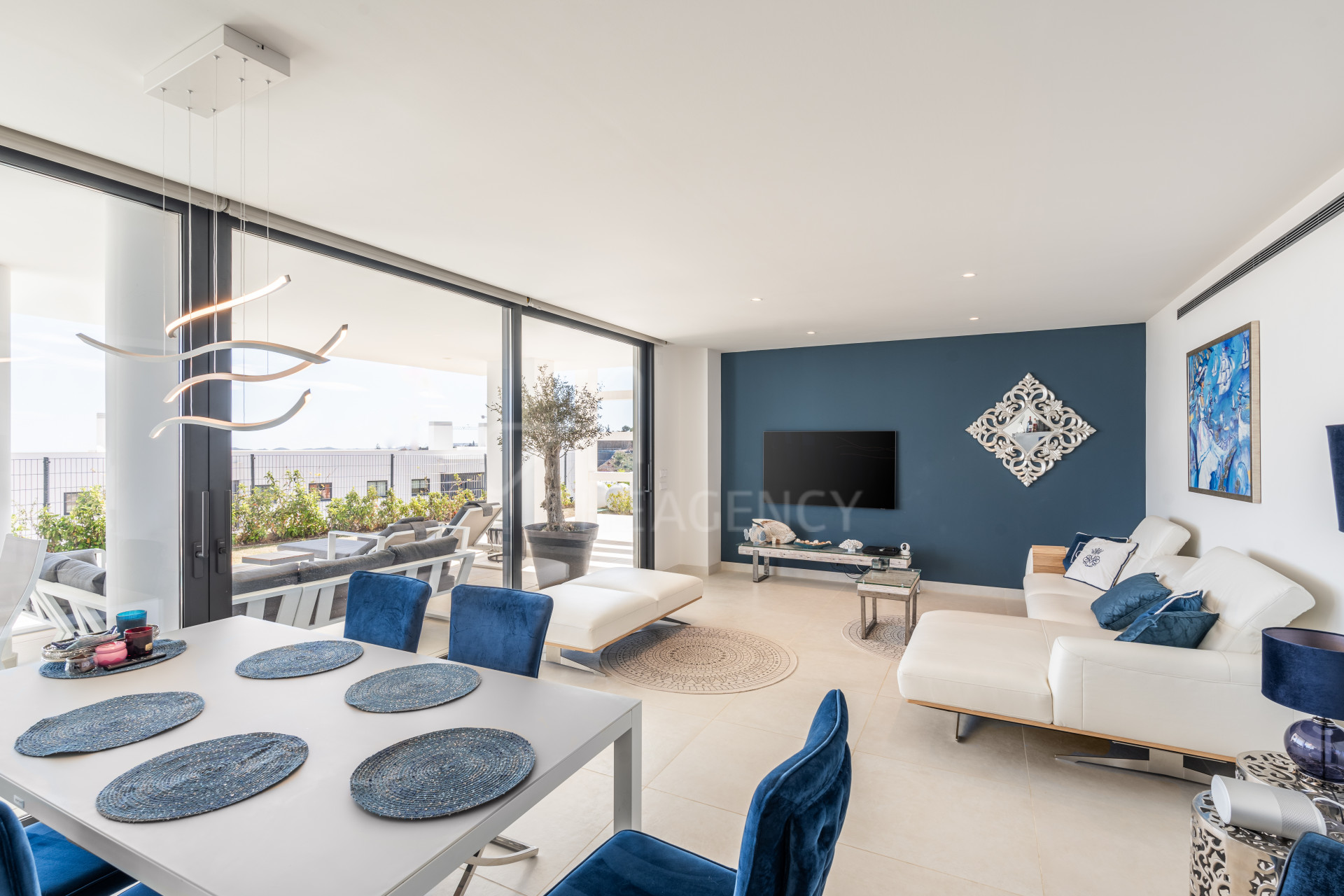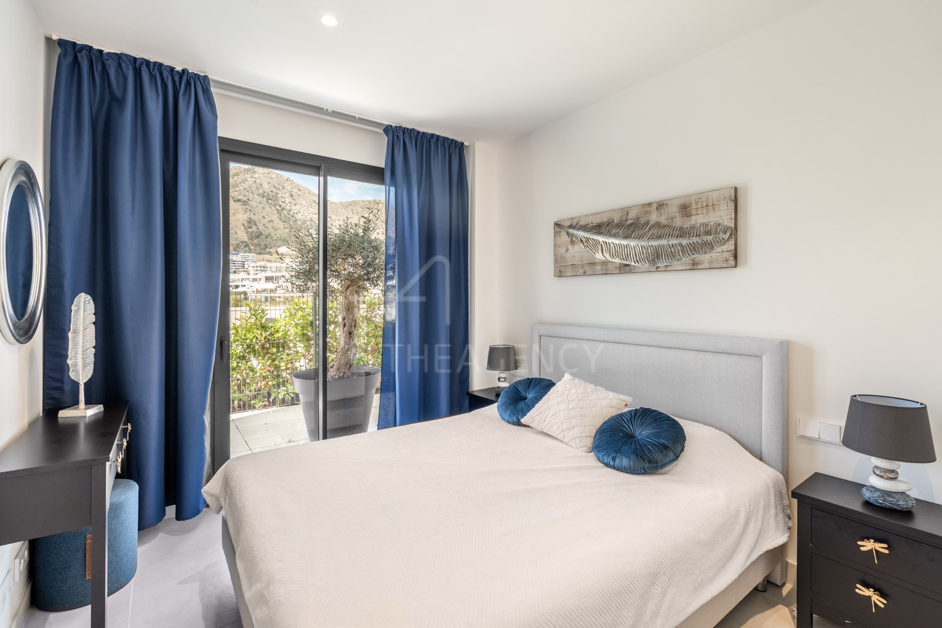 The apartment consists of three elegant bedrooms and two chic bathrooms, along with an additional guest toilet, making it both practical and plush. Each room reflects a blend of sophistication and comfort, creating a cozy yet airy atmosphere. The sleek open plan kitchen complements an inviting living space that opens out onto a panoramic terrace, offering breathtaking views of the sea and allowing for a seamless integration of indoor and outdoor living.