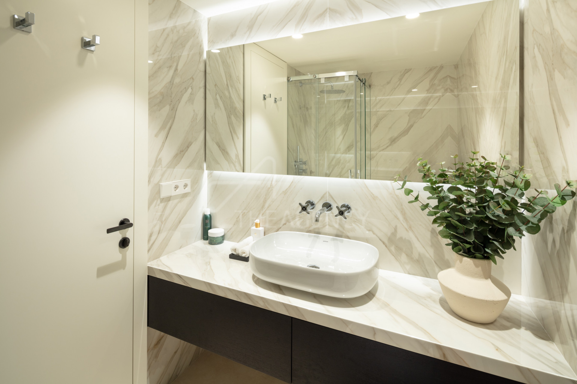 Each of the 3 bedrooms features an en-suite bathroom, finished with quality stone surfaces and custom wood details, creating a clean and timeless design throughout.