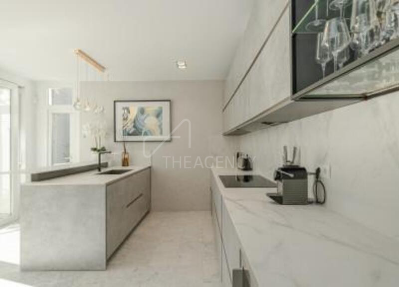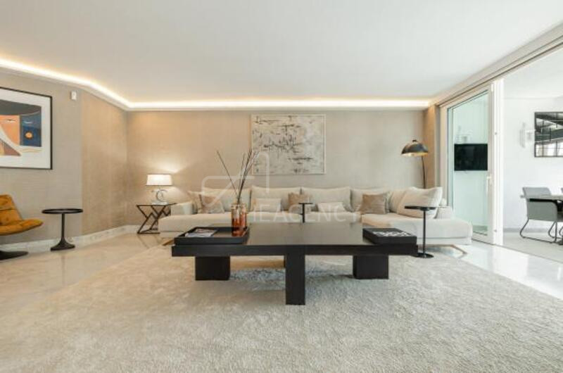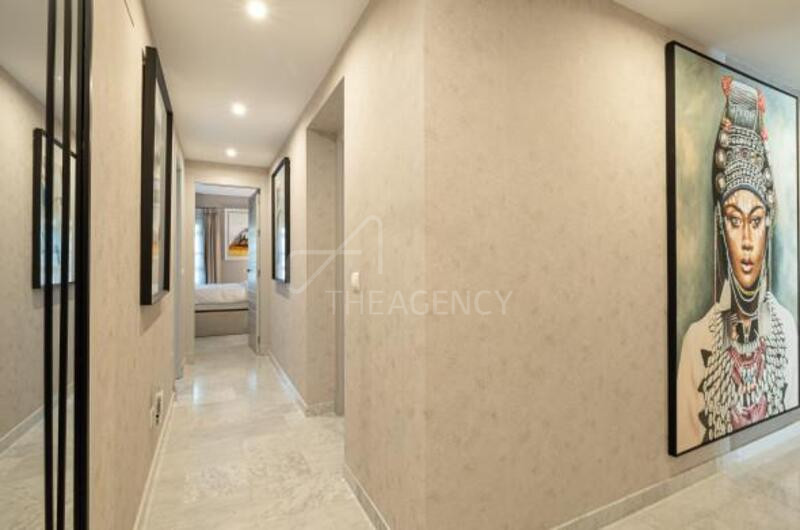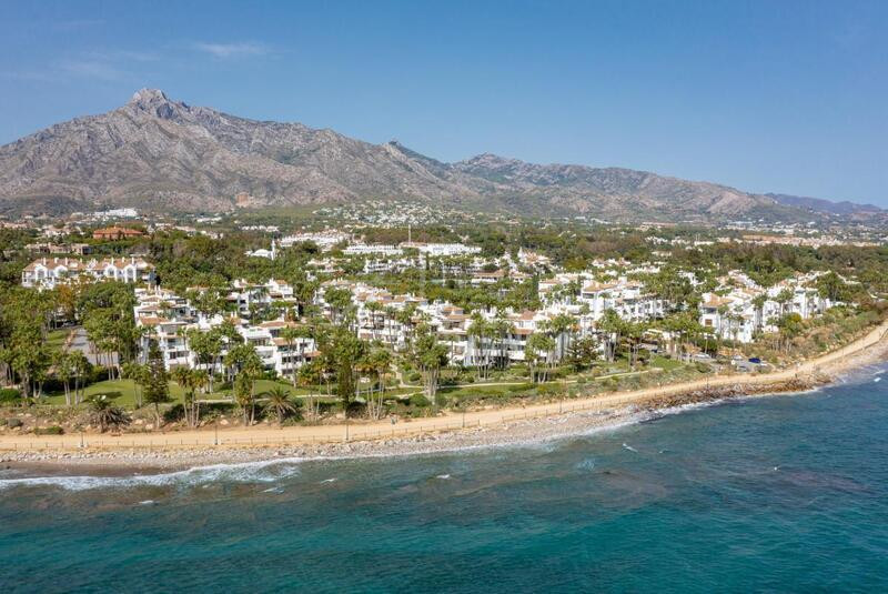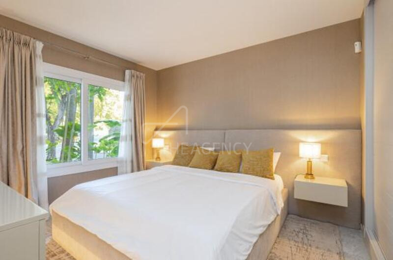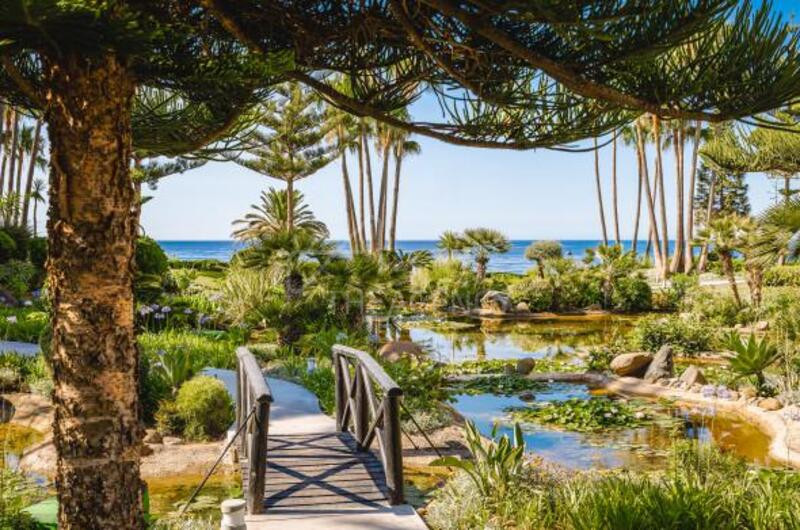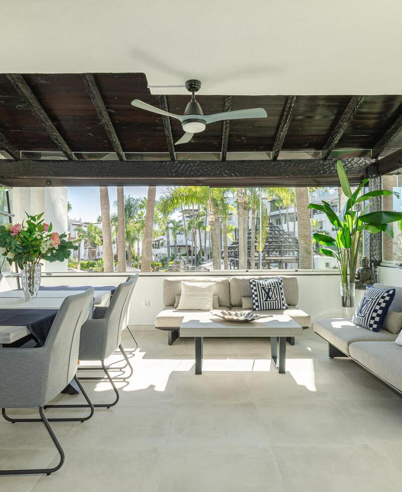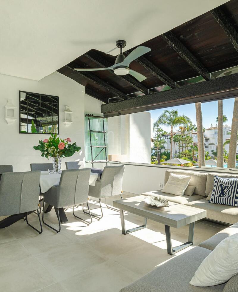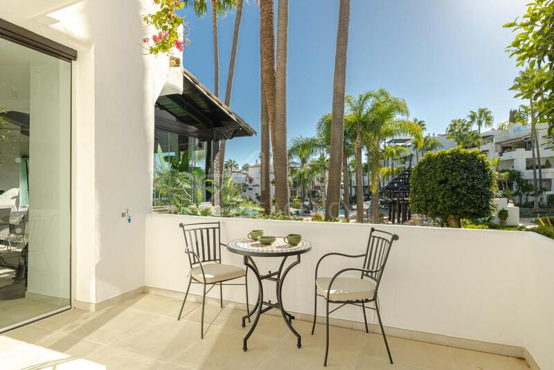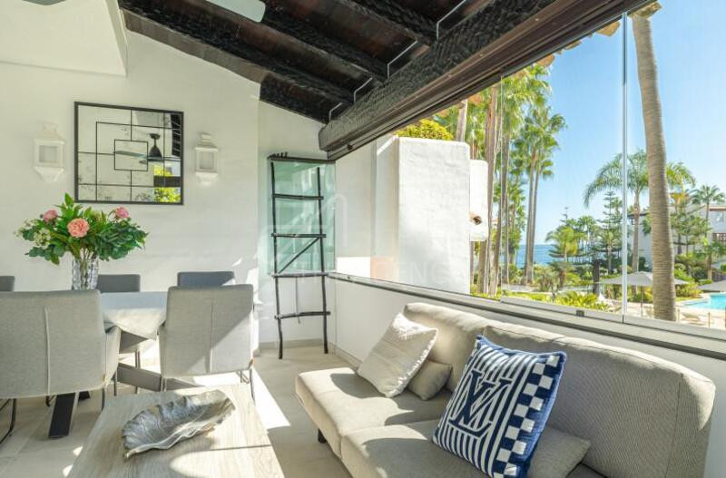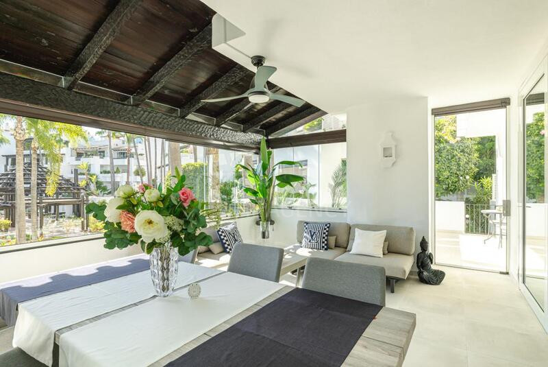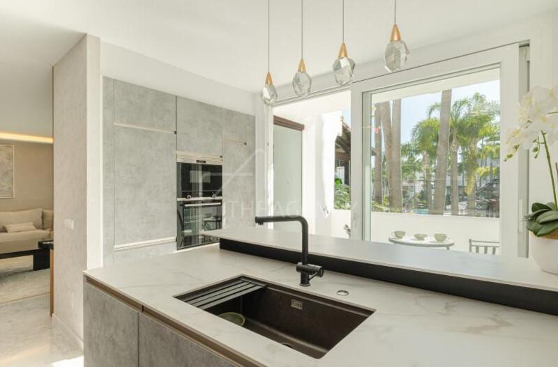 This meticulously renovated apartment, facing southwest, graces the sought-after beachfront complex of Jardines Japoneses within Marina de Puente Romano. Offering elevated luxury on a single level, the apartment boasts an inviting entrance hall that leads to a spacious lounge/dining room. From here, step onto the partially covered terrace, where you can enjoy views of the lush gardens and pool. The contemporary open-plan kitchen, featuring a central island, seamlessly connects to the terrace, creating a harmonious living space.