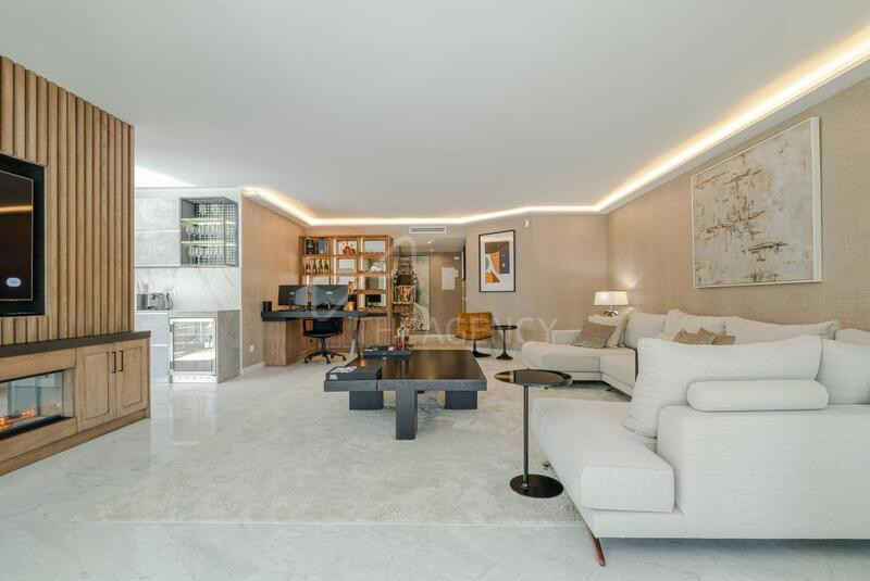 The apartment comprises a master bedroom suite and two additional bedrooms with two bathrooms, one of which is en suite. A parking space and a storage room on the underground level are included with the property, adding convenience to luxurious living. Rare and truly unique, this residence is a gem in one of the most coveted residential complexes along the coast.