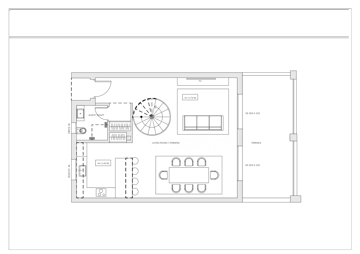 The main floor is designed for harmonious indoor-outdoor living, featuring an open-plan living and dining space that flows onto a spacious terrace—ideal for relaxing or entertaining. A sleek kitchen layout and a guest toilet add convenience to this level.