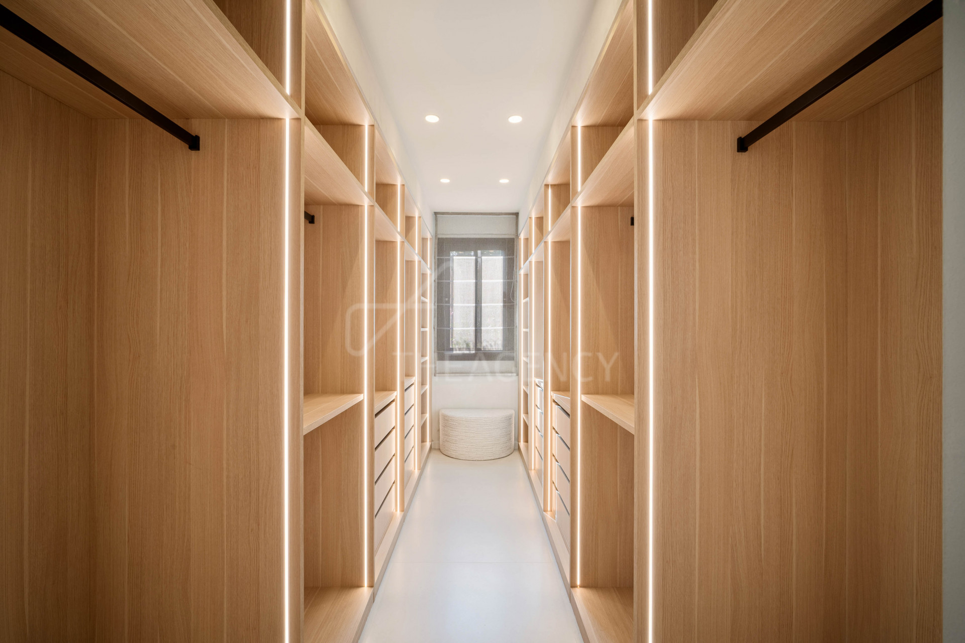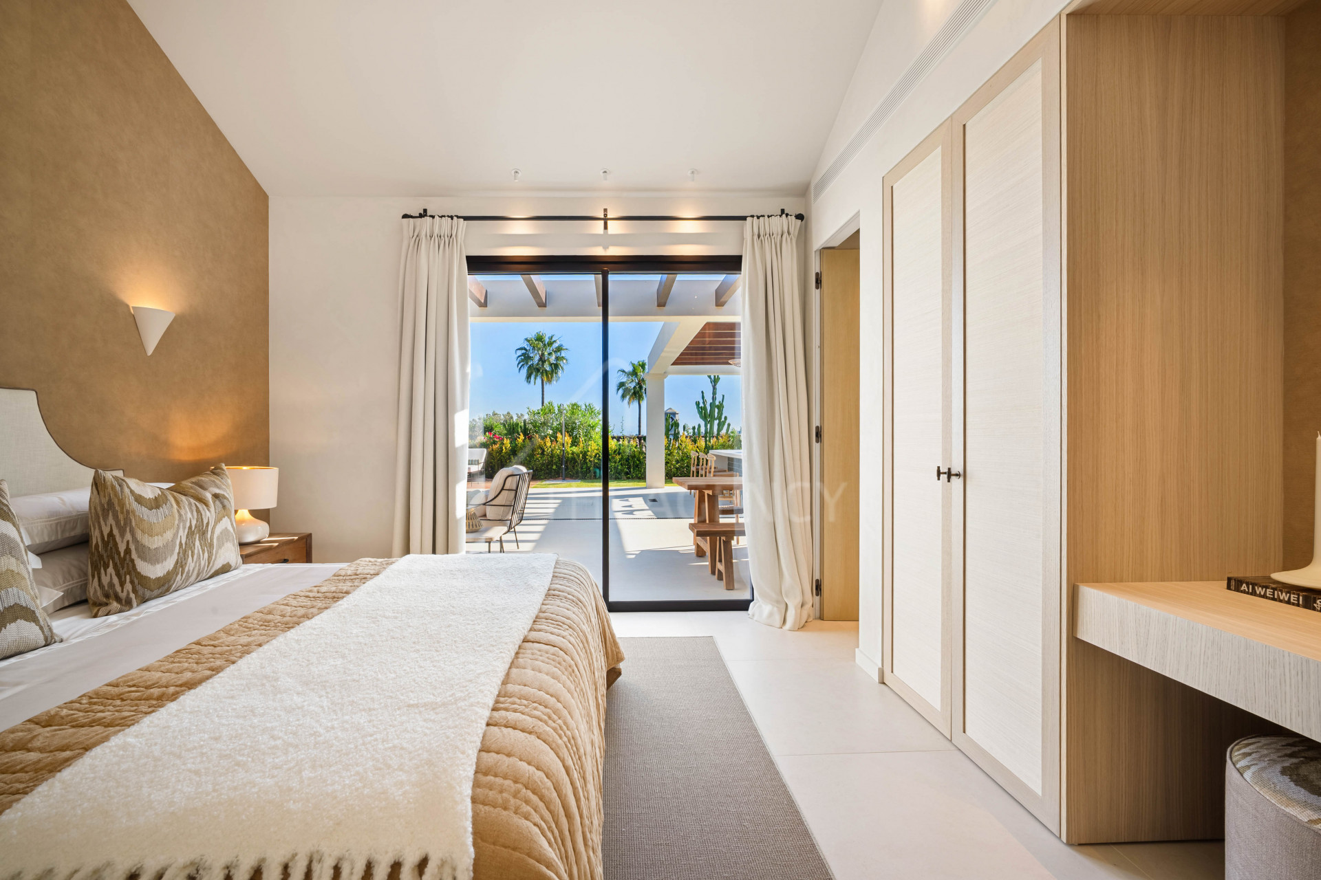 The villa includes four bedrooms and four bathrooms. The primary suite offers direct access to the garden and features a walk-in wardrobe and en-suite bathroom. Each bedroom is fitted with integrated storage and contemporary finishes.